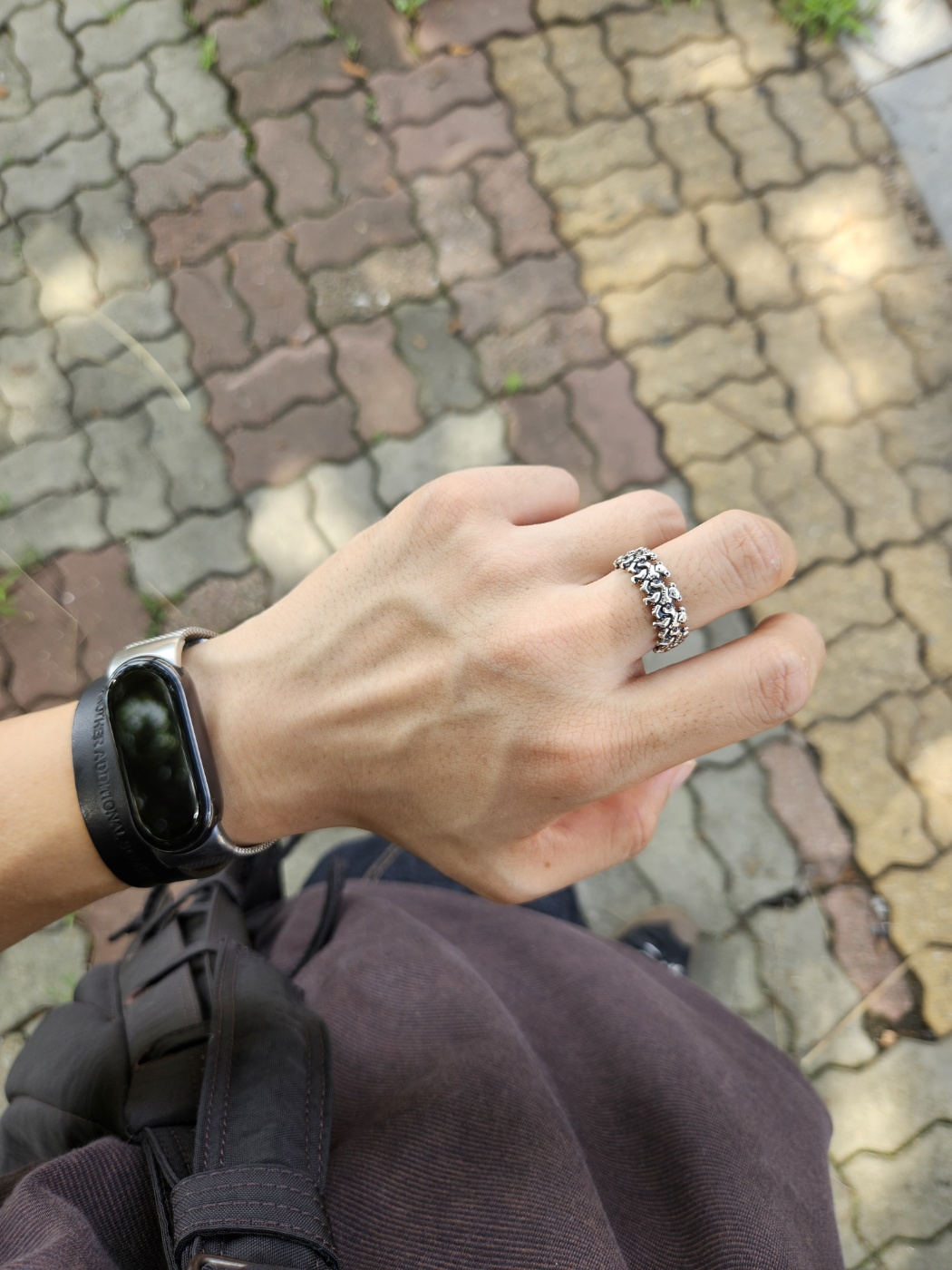 원래 검지에 끼려고 했지만, 쪼여서 중지에 끼고 다니는 그레이트풀데드 반지. 그냥 잘 찍혀서 사진 털어봄, 진짜 유니클로 에어리즘 없었으면 여름 못 버틴다. 에어리즘 깔별로 사서 입고 다니는 본인