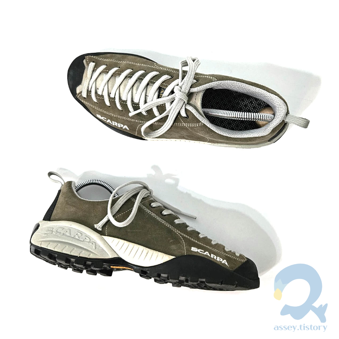 최근 메가트렌드인 고프코어의 유행으로 같이 떠오르고 있는 스카르파의 모히또 제품은 스카르파의 대표적인 어프로치 슈즈(암벽등반용 슈즈)이며 다양한 라인과 소재로 매 시즌 발매되고 있는 베스트셀러입니다. 좋은 기능성과 편안한 착화감을 제외하고도, 도시적이고 캐주얼한 디자인 때문에 더욱 주목받는 것 같습니다.